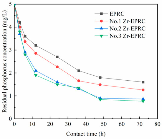 Figure 2 reveals that the modification of the substrate to enhance phosphorus removal is more effective when compared to the direct modification of EPRC particles (No. 1 Zr-EPRC particles). Both No. 2 and No. 3 Zr-EPRC particles exhibit significantly better phosphorus removal effects than No. 1 Zr-EPRC particles. This is attributed to the fact that in the case of the direct modification of EPRC particles, zirconium ions can only adhere to the outermost layers of the material, resulting in weaker attachment in terms of quantity and stability compared to substrate modification. Furthermore, when comparing the two groups of particles modified using substrate methods, the adsorption effectiveness of No. 3 is slightly superior to that of No. 2, although the overall difference is not substantial.