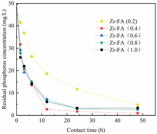 However, with a further increase in the mass ratio of zirconium chloride octahydrate, a surplus of activated zirconium oxides and hydroxides begins to block the pores of the adsorbent material, impeding the diffusion of phosphorus within these pores. Consequently, this leads to a reduction in the overall adsorption capacity. Therefore, it is judicious to conduct the modification of fly ash and steel slag with zirconium chloride octahydrate at mass ratios of 0.4 and 0.6. This approach achieves a balanced loading of zirconium onto the adsorbent substrate, thereby enhancing the pore structure, improving the adsorption efficiency, and minimizing material wastage.