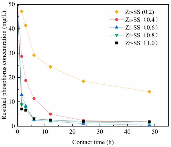 In a similar fashion, zirconium-modified steel slag was prepared by employing zirconium oxychloride octahydrate (m1) and steel slag (m2) with mass ratios of 0.2, 0.4, 0.6, 0.8, and 1.0, respectively. These modified steel slag samples were designated as Zr-SS. Static adsorption experiments were conducted on the modified steel slag powder.