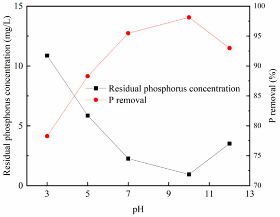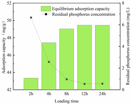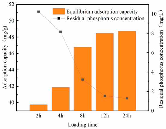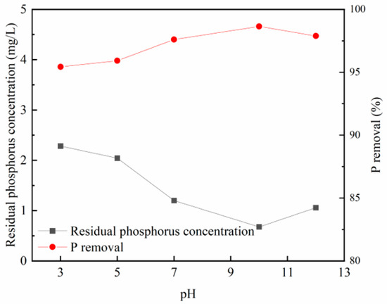 Figure 5 and Figure 6 illustrate that the phosphorus removal efficiency of both modified steel slag and modified fly ash experiences an initial enhancement with an increase in the loading solution’s pH. The optimal adsorption effect is observed when the loading pH reaches approximately 10. Beyond a pH of 10, the adsorption capacity of the modified materials gradually decreases.