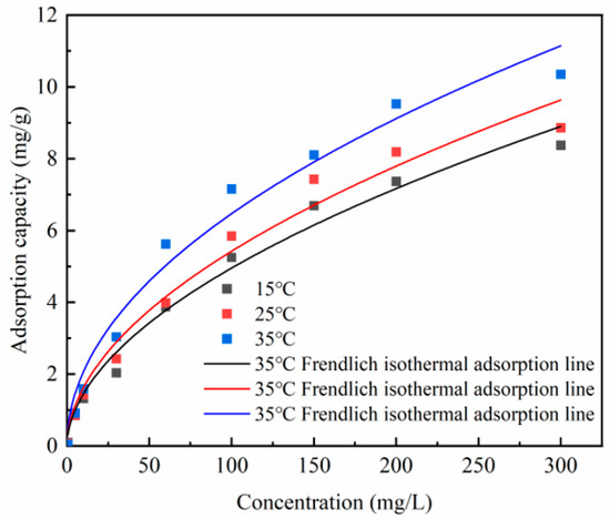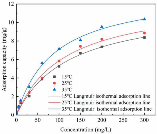 As shown in Figure 13 and Figure 14, the adsorption capacity of the Zr-EPRC particles gradually increased as the concentration of phosphate in the solution increased, ultimately reaching a stable value. Notably, temperature played a pivotal role in influencing the adsorption isotherm. At the same concentration, the adsorption capacity of the Zr-EPRC particles for phosphorus increased significantly with the rising temperature.