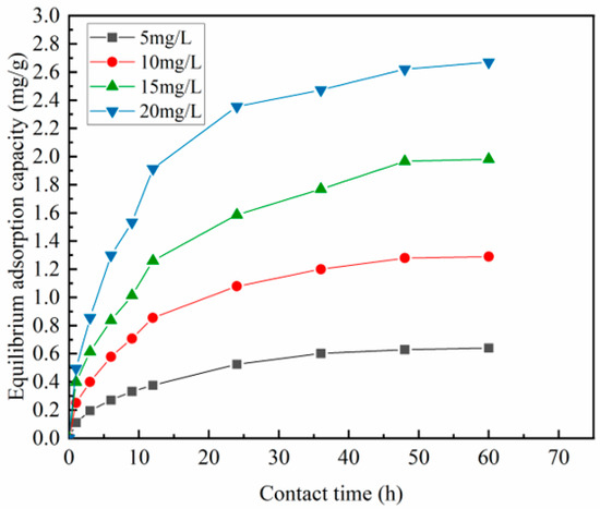 Different Initial Concentrations: Four portions, each containing 3 g of Zr-EPRC particles, were weighed and placed into separate 250 mL conical flasks. Next, 250 mL of “KH2PO4” solution with concentrations of 5 mg/L, 10 mg/L, 15 mg/L, and 20 mg/L were added to the respective conical flasks. These flasks were then placed within a constant temperature water bath shaker at 25 ± 1 °C and 150 rpm. At intervals of 1 h, 3 h, 6 h, 9 h, 12 h, 18 h, 24 h, 36 h, and 48 h, the supernatant of each solution was aspirated, and the residual phosphorus concentration in the adsorbed liquid was determined.
