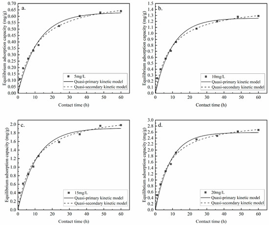Adsorption kinetics fitting at different concentrations. (a) Zr-EPRC adsorption at a phosphorus concentration of 5 mg/g; (b) Zr-EPRC adsorption at a phosphorus concentration of 10 mg/g; (c) Zr-EPRC adsorption at a phosphorus concentration of 15 mg/g; (d) Zr-EPRC adsorption at a phosphorus concentration of 20 mg/g.