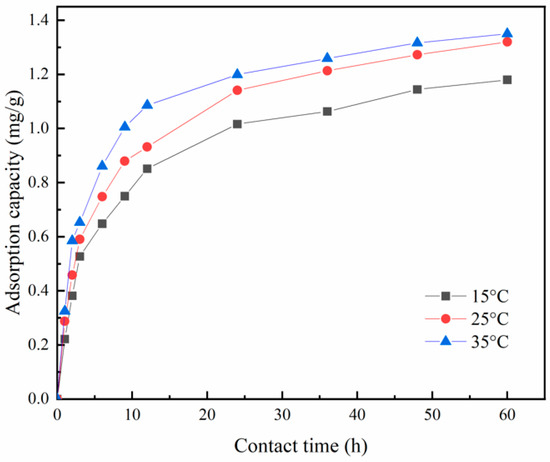 Different Initial Temperatures: Three portions, each containing 3 g of Zr-EPRC particles, were weighed and placed into separate 250 mL conical flasks. In these flasks, 250 mL of 20 mg/L “KH2PO4” solution was added. The conical flasks were then positioned within a thermostatic water bath shaker (150 rpm) set at temperatures of 15 °C, 25 °C, and 35 °C. The adsorption time was maintained at 1 h, 3 h, 6 h, 9 h, 12 h, 18 h, 24 h, 36 h, and 48 h, and the supernatant of each solution was aspirated at these intervals to determine the residual phosphorus concentration in the adsorbed liquid.