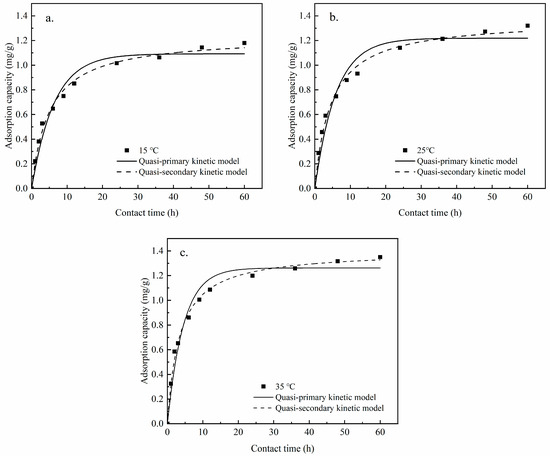 Adsorption kinetics fitting at different temperatures. (a) Zr-EPRC adsorption at phosphorus concentration at 15 °C; (b) Zr-EPRC adsorption at phosphorus concentration at 25 °C; (c) Zr-EPRC adsorption at phosphorus concentration at 35 °C.