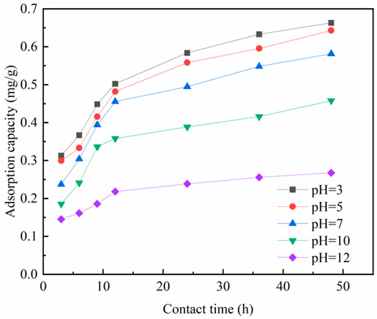 pH: Five portions of 5 g Zr-EPRC adsorbent material were immersed in a phosphorus solution with an initial concentration of 10 mg/L. The pH levels of these solutions were adjusted to 3, 5, 7, 10, and 12 using 1 mol/L NaOH and 1 mol/L hydrochloric acid solutions. Static adsorption was carried out at a constant temperature of 25 °C. At intervals of 3 h, 6 h, 9 h, 12 h, 24 h, 36 h, and 48 h, the phosphorus concentration in the solution was determined.