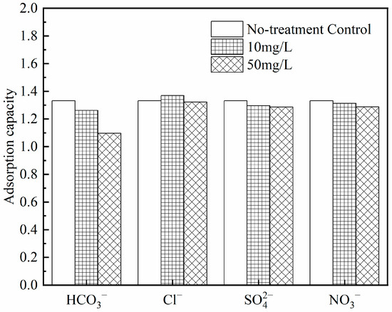 Figure 20 demonstrates that Zr-EPRC particles exhibit a strong resistance to interference from co-existing anions, maintaining effective adsorption capacity for phosphorus removal even in the presence of competing ions. When analyzing the impact of each interfering ion on the adsorption capacity, the following observations can be made: