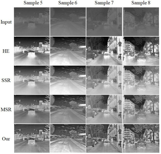 Figure 4 shows the input images and enhanced images of our method and other algorithms. We selected four representative images for a comprehensive comparison, including sequences with multiple targets, no targets, and mixed targets. For the first image, the HE method makes the roof of the car on the road too dark and other parts of the car too bright. Although the SSR [32] and MSR methods do not make the car appear obviously locally too bright or too dark, they make the lines on the road unclear. Our method not only avoids partial over-brightening or over-darkening of the cars, but also maintains the details of the lines on the road. For the second image, the HE method makes the sky darker, resulting in some clouds not being easy to notice. The images processed using the SSR and MSR methods have more clouds, but the details on the road are still unclear. The use of our method to enhance the image can not only clearly exhibit the clouds in the sky, but also preserve the details on the road. For the third image, the HE method makes the car and the building on the right appear too bright, and the SSR and MSR methods make some textures of the building blurred, so their images are not as detailed as those of the HE method. Our method not only avoids the local over-brightness caused by the HE method, but also makes the details of the building clearer than the SSR and MSR methods. For the fourth image, the HE method not only makes the tires of the car appear too bright, but also gives the trees above part of the image similar brightness to the night sky, which lowers the contrast between trees and the night sky. Our proposed method improves the contrast between trees and the night sky and clarifies the details between layers.