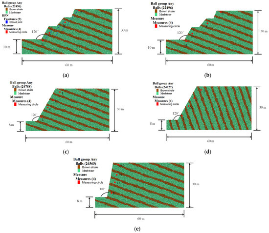 PBM was utilized to simulate the contact between the particles and reproduce the rock behavior within the model. LM was used to act as the interlayer contact between the mudstone and brown shale particles, while SJM was adopted for the simulation of the rock joint. Notably, the designed lines were digitalized in CAD and then imported into the PFC 2D numerical model to act as the joint. Additionally, four measuring circles were strategically arranged on the side of the slope surface to monitor the stress and strain state during the landslide simulation. In this study, three boundaries of the simulation model were constrained by a rigid wall. The excess particles outside the slope wall were directly deleted to simulate the excavation of the mining process. Then, we began to calculate under gravity to reach a new equilibrium. In PFC 2D, the safety factor can be calculated by the gravity increase method, which is defined as the ratio of the gravitational acceleration in the limit state to that in the initial state, according to [39,40]. This study did not concentrate on the stability analysis by calculating the safety factor and instead focused on the failure process and mechanical damage mechanism.