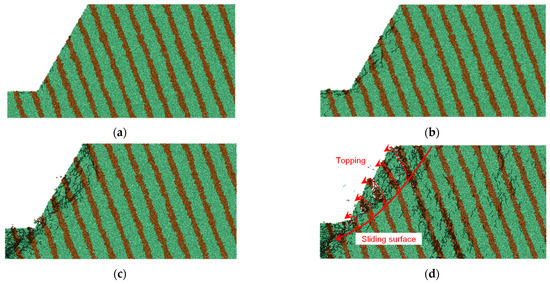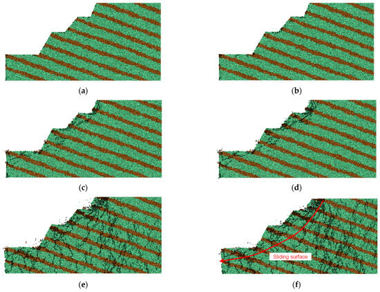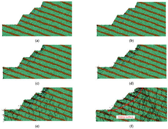 The cracks initiated from the slope toe, the edge of the slope surface, and the top of the slope (Figure 10a), and subsequently propagated and extended toward the inside of the slope (Figure 10b), leading to the generation of a curved sliding surface. Then, a curved sliding zone along the slope surface formed (Figure 10c). Due to gravity and the overlying squeezing effect, the small rock blocks cut by the cracks began to slip downward or fall outward. With the increase of the time step, large rock blocks slid along the sliding surface, which induced the final shear-slip instability of the interbedded anti-dip rock slope.