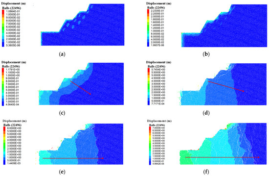 According to Figure 4a, the largest displacement occurred along the slope surface at the time step of 100, and the area in the vicinity of the joints also showed a larger displacement than the other areas. With the increasing time step, the overall displacement of the slope increased (Figure 4b). In contrast to the displacement at a time step of 100, the displacement of the area around the joints significantly decreased, indicating that the contact of the joint surfaces became tighter under gravity. For the 1000 time step (Figure 4c), the displacement increased as the distance to the slope surface increased. Furthermore, following the direction of the red arrow, the color gradient from light blue to dark blue became clear, and the color layering and transition were very obvious. Cracks were more likely to develop due to the change of the deformation. When the time step reached 5000 (Figure 4d), the rock mass of the slope top became fragmented, leading to a sharp decrease in the carrying capacity of the rock slope. Simultaneously, significant deformation occurred at the top of the slope, accompanied by the dropping of small fragments. Subsequently, the deformation extended further from the slope surface toward the interior of the slope, and the area of the dark blue decreased as the test proceeded (Figure 4e,f). From Figure 4f, the crack coalescence resulted in the downward sliding of rock blocks, ultimately leading to a larger deformation and overall damage to the rock slope.