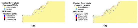 The stress distributions observed from the contact force chain evolution in the two kinds of rock slopes (i.e., with and without pre-existing joints) were also similar (Figure 5 and Figure 8). However, it is worth noting that the number of contacts in the rock slope without joints was slightly higher than that in the slope with joints, which indicated that large strength and high stability occurred in the rock slope without pre-existing joints.