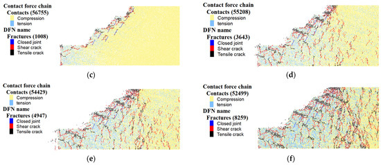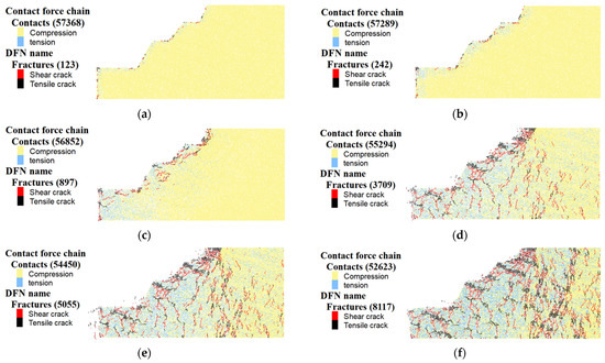 Figure 5. Contact force chain progression of a slope with closed joints. (a) Time step = 100, (b) Time step = 200, (c) Time step = 1000, (d) Time step = 5000, (e) Time step = 10,000, (f) Time step = 30,000.