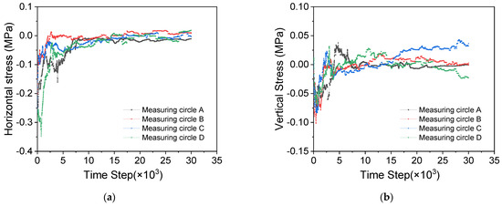 Figure 6. Stress distribution status around the measuring circles in a slope with closed joints. (a) Horizontal stress, (b) Vertical stress.