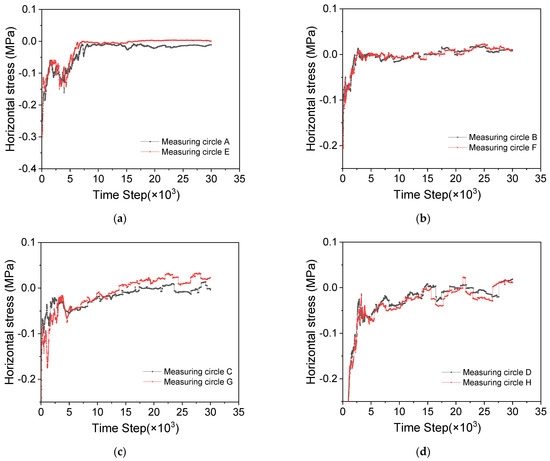 Figure 6 depicts the stress distribution at the measuring circles on the rock slope with joints. In the initial stage of the simulated test, particles near the slope surface slid downwards and accumulated at the slope toe due to the effects of gravity. As a result, both the horizontal and the vertical stresses increased at the beginning. Subsequently, micro-cracks were generated from the locations around the measuring circles, resulting in the stress decreasing. When the small cracks propagated, coalesced, and connected, the stress in the vicinity of the measuring circles tended to approach zero. Under the influence of the overlying load and gravity, the stress level gradually increased with the increasing distance from the measuring circle to the top of the slope. The distribution of the stress at the measuring circle locations was related to the crack distribution and changes in displacement during the slope failure process.