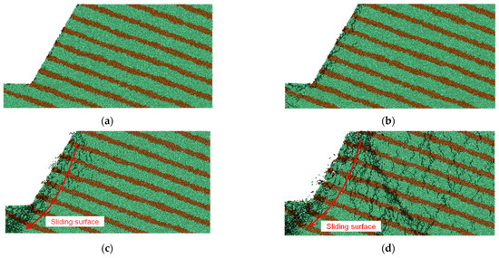 Compared with the interbedded anti-dip slope with 20° dip angle of the rock stratum, cracks do not occur on the top of the slope at first (Figure 11a) but on the slope toe under the action of gravity and the overlying load from rock mass when the dip angle of the rock stratum is 70°. The cracks propagated nearly perpendicular to the rock strata (Figure 11b). The low interlayer contact strength between the two rock layers and the large dip angle of the rock layers led to the easier initiation of micro-cracks. Subsequently, the deformation of the upper part of the slope became pronounced, and long cracks occurred along the bedding plane (Figure 11c). With the further development of interlayer fractures, the fracture and slip of the rock mass at the bottom of the slope caused the overlying rock mass to lose its support. The rock mass along the fractured surface became increasingly fragmented and then slid along the sliding surface, while the rock mass in the middle and upper sections of the slope exhibited noticeable bending and fracturing. Finally, a combined failure involving toppling and sliding took place in the interbedded slope with a rock dip angle of 70° (Figure 11d).