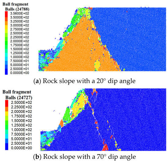 The fragmentation patterns of the anti-dip interbedded rock slope with different dip angles are shown in Figure 12. The rock slope model with a 20° dip angle of rock layers produced a greater number of fragments compared with the slope model with a 70° dip angle. In addition, the size of the fragments showed different characteristics in the two slopes with different dip angles. There were larger fragments in the interbedded anti-dip rock slope with a 70° dip angle. Large rock fragments or blocks typically toppled over rather than sliding along the sliding surface. The varying numbers and sizes of the fragments also indicate the differences in the rock slopes with two kinds of dip angles.