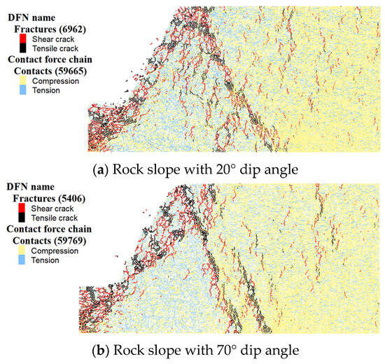Figure 10 and Figure 11 depict the crack evolution in rock slopes with different rock strata dip angles (20° or 70°).
