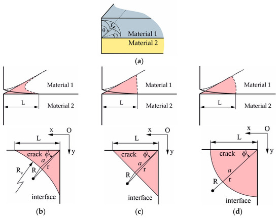 In Figure 3, a comprehensive view of the interface crack front is presented, displaying its intriguing variability in shape—concave, straight (triangular), or convex. The crack length, denoted as a, is a fundamental parameter in this representation, while r and θ serve as essential polar coordinates that aid in characterizing the crack’s geometric intricacies.