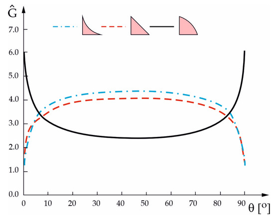 Normalized energy release rate for the three shapes of the crack front for the crack at the Al2O3/steel interface in terms of the angle θ.