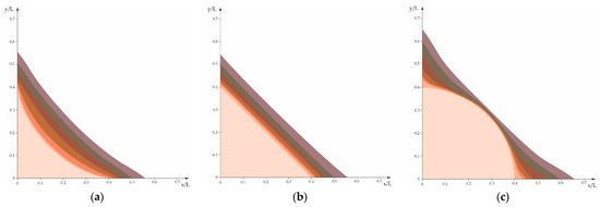 Examining Figure 5 provides valuable insights into the crack propagation dynamics. Notably, the quarter-circle-shaped crack exhibits swift progression near the free surface zone but considerably slower advancement in the central region. Conversely, this trend is inverted for concave and triangular cracks, where the central front advances at a faster pace compared to the edge areas. These observations collectively suggest that the triangular shape of the corner crack front presents a higher degree of stability. To substantiate these findings, two additional material combinations were subjected to testing, involving the propagation of corner cracks with three different front shapes: concave, straight, and convex.