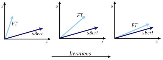 The three figures depict the distance minimization procedure. Two sentence vectors represented by FastText (light blue point) and sBert (dark blue point) sentence vectors belonging to the same sentence. The objective is to minimize the distance (angle) between the vectors by moving FastText sentence representations towards sBert.