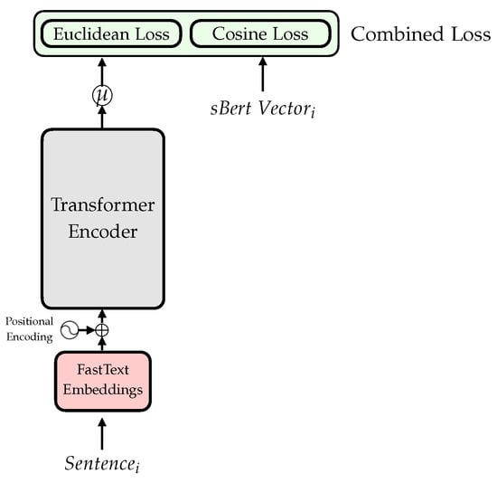 The proposed model architecture (Figure 2) consists of a word-embedding layer and a transformer encoder structure. The encoder structure generates embeddings for all words in a sentence. For each batch, the encoder produces a tensor of shape , where D represents dimensionality, L indicates sentence length, and B denotes the batch size. The average of the tensors with shape , resulting in an output tensor of shape . Subsequently, the loss is calculated by using the Euclidean and the cosine distances, each with equal weights.