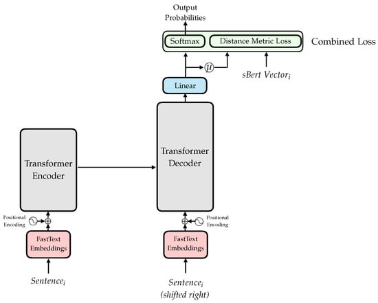 To facilitate the information transfer, we propose utilizing a sequence-to-sequence transformer model (Figure 3). In this method, the word embedding layers are shared between the encoder and the decoder parts of the model. The input sentences are initially processed by the encoder, during which a set of representations are generated for each word based on their positions in the sentences. These representations are then provided to the cross-attention module within the decoder. For each position in the target sequence, the decoder leverages the cross-attention module to interpret the relationship between the encoder’s representations (key–value pairs) and its own queries to predict the subsequent word in the output sequence, utlizing cross-entropy for training, hence minimizing the perplexity values. After the decoder generates a set of representations for each word in the output sequence, these representations are then averaged to obtain sentence vectors. Finally, all generated sentence vectors are compared with their sBert counterparts.