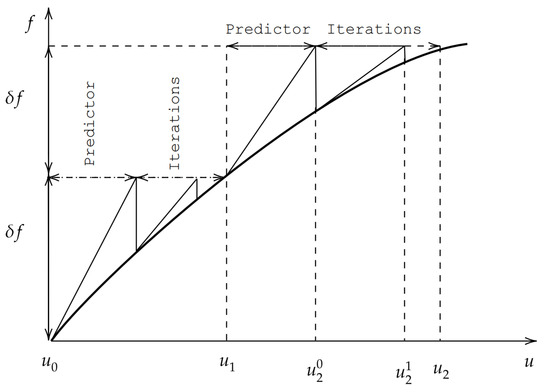 The biggest issue with the incremental method is the accumulation of errors as the load increments are applied. As it can be seen in Figure 5a, considering point 2 of the diagram, the solution given by the method drifts from the equilibrium curve of the solution. As the load increases, these errors will accumulate. As the nonlinearity of the solution increases, , the number of cumulative errors will increase as well. As a way to overcome this fact, an iterative method is required. One of the most commonly used is the Newton–Raphson incremental scheme. In short, the Newton–Raphson method only provides the displacement, u, of a pre-defined load, f, as it is shown in Figure 5b.