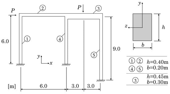 Geometry, boundary, and load conditions of the two-bay asymmetric frame.