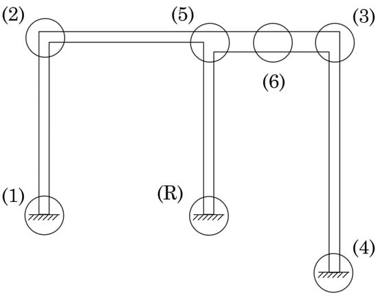 The base of elements 1 and 5 are completely locked in all degrees of freedom (u and v), while a connection at the base of element 4 is considered (R), allowing the rotation of the element, with the displacements being locked as well. The length of the elements considered and the cross-section dimensions are shown in Figure 7.