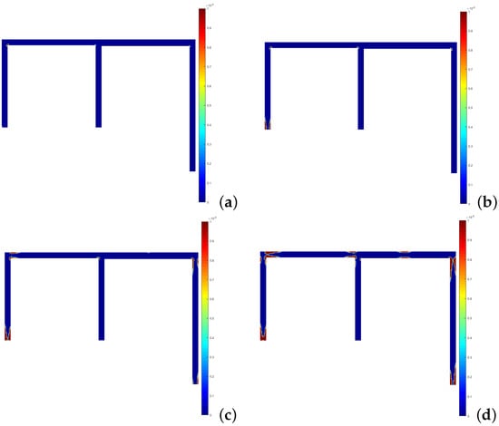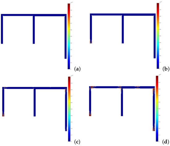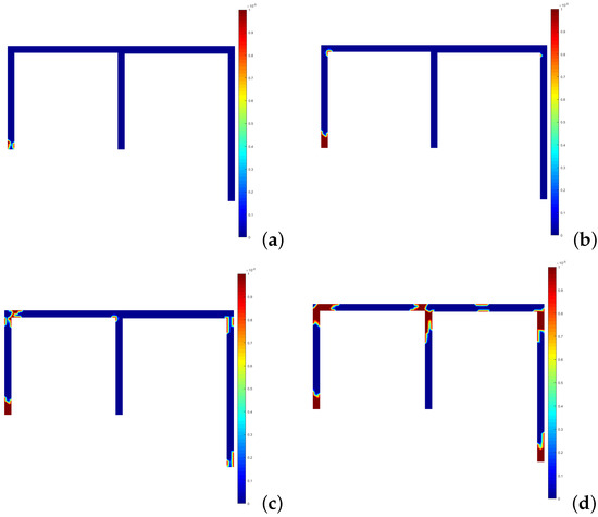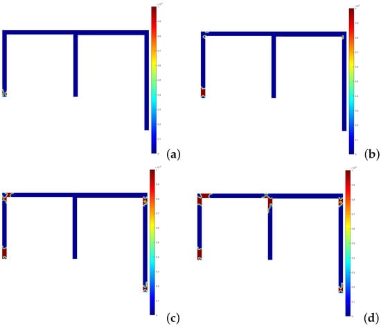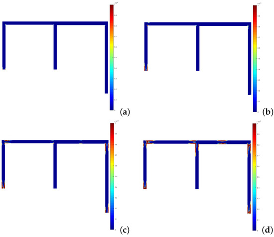 Development of the plastic connections for the FEM—3D case: (a) 23 . (b) 30 . (c) 33 . (d) 36 .