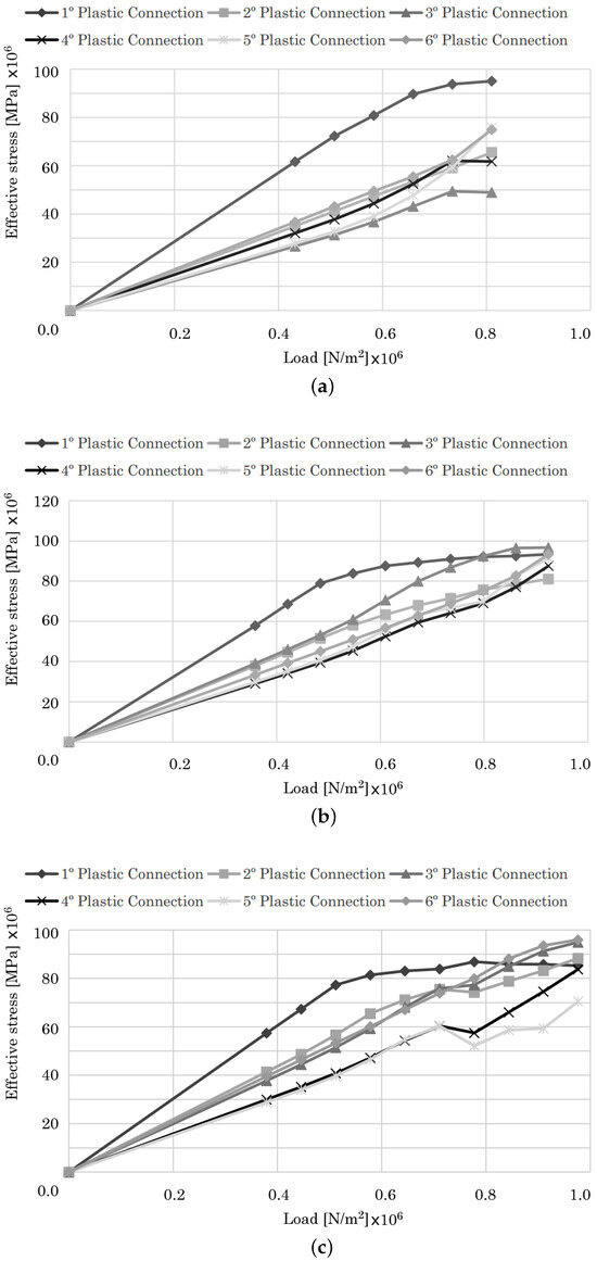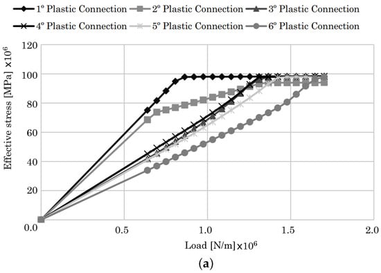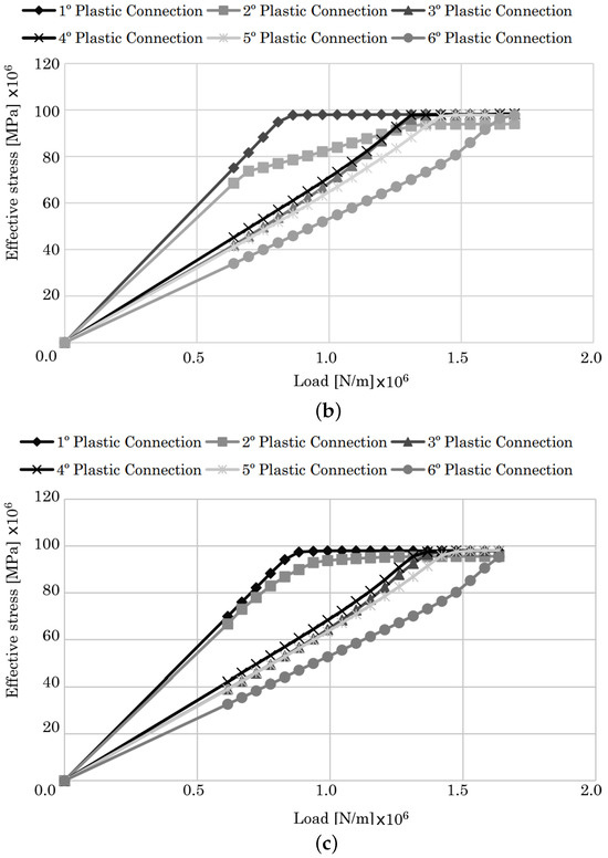 The diagrams showing the evolution of the effective stress on the identified plastic connections are presented in Figure 13. As can be seen in the figure, for all three numerical methods used, the evolution of the effective stress is quite similar. An interesting detail to be analyzed is the evolution of plastic connections 1 and 2. In fact, plastic connection 2 enters in plastic regime first, when compared to plastic connection 1. Comparing Figure 10, Figure 11 and Figure 12, in terms of effective plastic strain, both data seem to contradict each other. However, in truth, plastic connection 1 has a very rapid transition between elastic and plastic behavior, while plastic connection 2 is slower in the same transition, as can be assessed by the curvature of both plastic connections shown in the diagrams. Another important aspect of the diagrams presented is the stabilization of the stress level at a certain load applied. After a certain load is applied, the effective stress maintains its value, as it should in a complete plastic regime. We can clearly see the evolution and transition from linear elastic regime to plastic regime, ending with stabilizing the effective stress, even when the load is increased.
