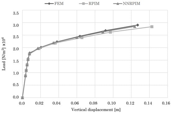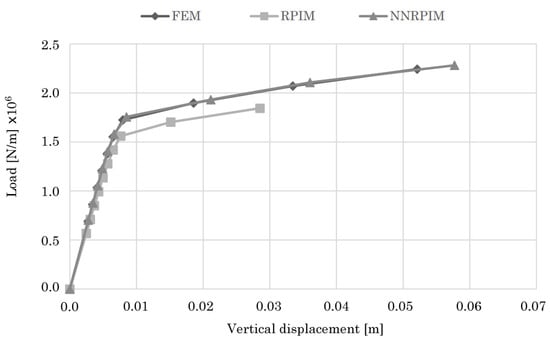As it can be seen in Figure 15, the FEM and NNRPIM obtain almost equal results, in that the load/displacement curves for the two numerical methods are almost equal to each other. As for the RPIM curve, it follows the tendency of the FEM and NNRPIM up to a certain point. It then deviates to a lower level when compared with the other two curves. Nevertheless, all three results are very similar to each other, and good agreement between them exists.