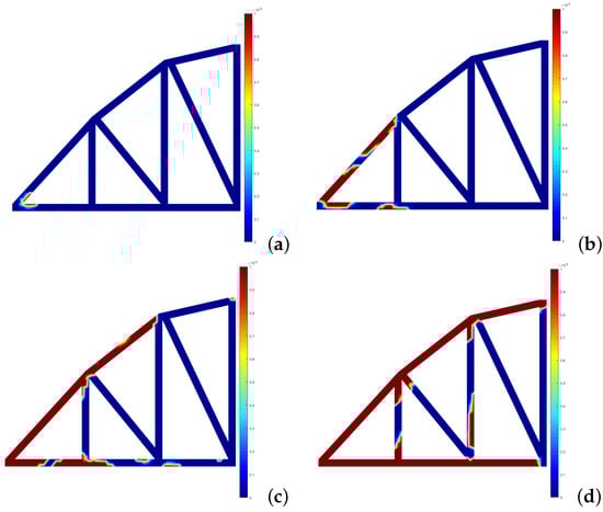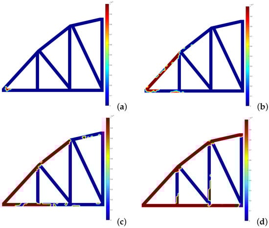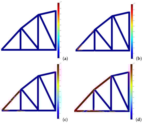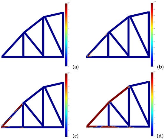 Development of the effective plastic strain for the RPIM—3D case: (a) 1.09 × N/m. (b) 1.75 × N/m. (c) 2.18 × N/m. (d) 2.84 × N/m.