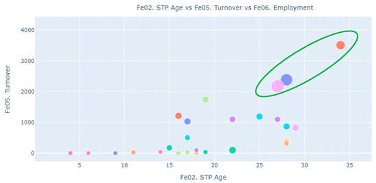 Age (Fe02) vs. turnover (Fe05) vs. employment (Fe06) in Spanish TPs. Fe06 is represented proportionally to the size of the marker. Each coloured spot represents a different STP. “Big TPs” are highlighted with the green oval.
