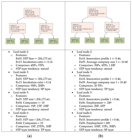 Decision tree and rule description for: (a) 10 core features with significative differences among STP types; and (b) 9 core features with significative differences among STP types.