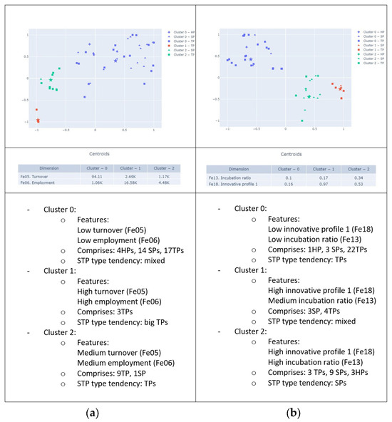The centroids of each cluster represent the typical features and can indicate the distance of an STP from the prototype. This distance can support decision making in the management of an STP. For example, in the case of an STP—that is classified as an SP, focuses its objectives on fostering innovation and entrepreneurship (Figure 7b), and has, for instance, an incubation ratio of 0.22—this analysis suggests that it should set policies to reach the value of 0.34 to be in the range of its prototype SP.