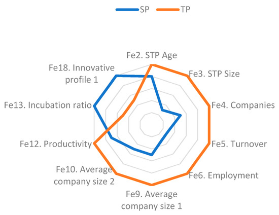 This in-depth study is planned for other geographical regions. So far, it has only been possible to replicate it for the Argentinean case, where a comparative study has also been established for the Spanish case [24]. In Argentina, three types of STPs are also validated, the proportion being: 41% SPs, 17% HPsm and 42% TPs. Therefore, SPs are proportionally more numerous than in Spain. The prototype characteristics obtained for the Argentinean case focus on the size and number of companies. The SPs are significantly larger than the TPs, although with a smaller number of companies, more focused on biotechnology or chemical sectors compared to the TPs, which have a larger number of companies focused on ICT.