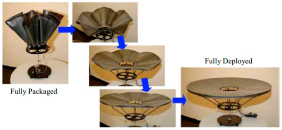 The deployable structure of space antennas is a critical component that facilitates antenna deployment and ensures the precision and stability of the antenna surface. The deployable mechanism occupies a substantial portion of the antenna’s overall mass, serving as the structural backbone that directly influences the antenna’s stiffness and natural frequency. Various deployable antenna mechanisms have been developed, including the ring truss type, unit frame type, folding rib type, winding rib type, cable tension type, ring column type, and flexible self-rebound type, among others [2,3,4,5,6,7,8,9,10,11]. However, the current deployable antenna unfolding methods are mostly fixed and primarily involve circumferential unfolding. Therefore, there is a need for innovative unfolding methods that can expand upon the existing configurations, drawing inspiration from nature’s own mechanisms.
