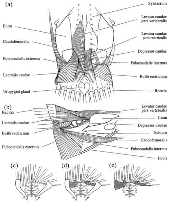 Muscle structure of bird tail. (a) Top view of pigeon tail morphology. (b) Left view of pigeon tail morphology. (c) Traditional tail fan model. (d) Baumel (1988) fantail model. (e) Stephen (1996) fantail model.