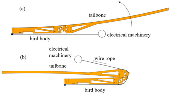 As inferred from the aforementioned bionic mechanism, the second stage of unfurling in the bird’s tail feathers hinges primarily on the extension of the lateral tail muscles and the control exerted by the Bulbi rectriciums. By adhering to the bionic concept, the structure detailed in Figure 11 was conceived.