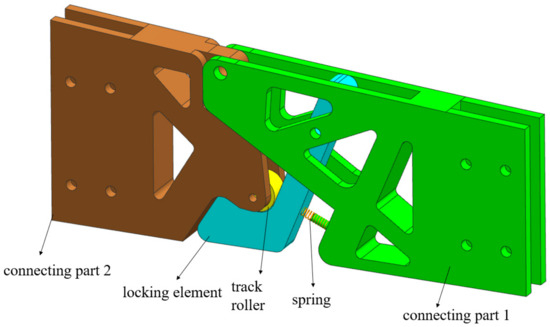 In the microgravity environment, only the frictional force and moment of inertia between the components are considered for the drive method. Opting for a rope drive, as opposed to the conventional methods, results in reduced mass and space utilization. A self-locking hinge was engineered to secure the final stage of locking, as depicted in Figure 10. Connector 1 is affixed to the inner rib, while connector 2 is secured to the outer rib.