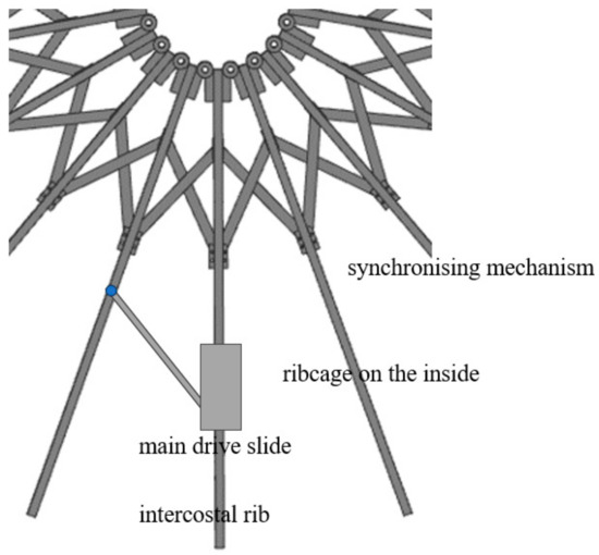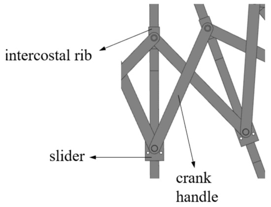 To replicate the pulling force exerted by the Bulbi rectricium on the distal end of the rudder feather, a shearing unit comprised of guide rails, a slider, and a linkage mechanism was interposed between two adjacent ribs, as shown in Figure 12. This arrangement ensures the synchronized movement of the antenna ribs during the unfolding process, while also allowing control over the movement speed and trajectory.