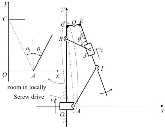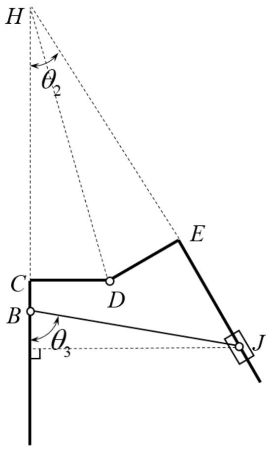 The connecting rod is divided into two parts: the driving linkage part and the synchronous mechanism part, as shown in Figure 18 and Figure 19. Through the solution of the geometric position of each linkage, Equations (2) and (3), respectively, were solved.