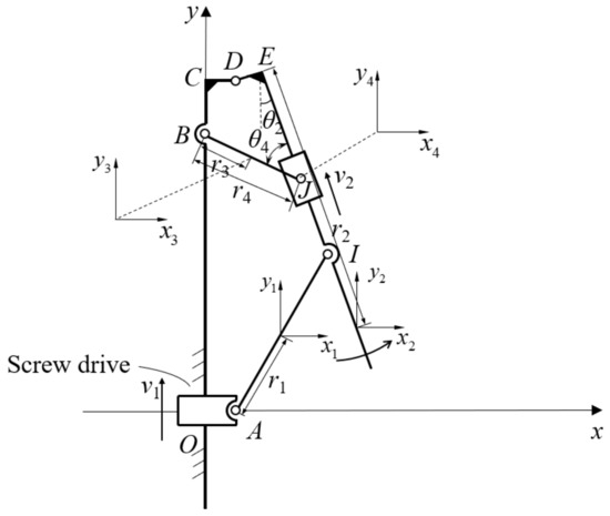 The linear velocity of the center of mass of each linkage is decomposed into components along the x and y axes to obtain the expression of each velocity (Component (9)), and the combined velocity is solved using Equation (10).