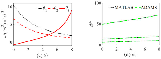 The changes in kinematic parameters were computed, as depicted in Figure 21a–c. The 3D model generated using UG_NX 12.0 software was imported into ADAMS for the simulation. The resulting data were then cross-referenced with the MATLAB outcomes to validate the accuracy of the kinematic analysis. Figure 21d illustrates the angular displacement curves of the rod in both MATLAB and ADAMS software, demonstrating congruence and affirming the validity of the kinematic analysis theory.