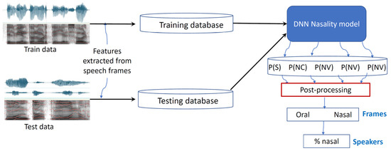 Recently, Mathad et al. [30] proposed an innovative approach (see Figure 2) that overcomes the two above-mentioned limitations. In their model, training was carried out with speech samples from healthy speakers, which allowed them to use one freely available large database to train a DNN model. Specifically, they used 100 h from the Librispeech corpus [31]. To train the system, the speech samples were divided into short windows from which MFCCs are computed and based on phonetic transcriptions, classified into one of four classes: oral consonant (OC), oral vowel (OV), nasal consonant (NC), and nasal vowel (NV). During the testing phase, the system was fed with new MFFC vectors, which are classified as belonging to one of the four classes. This allows computing the severity of nasality as the number of frames that are nasal divided by the total number of frames (per speaker or utterance). The results showed that the correlation between the scores of the DNN and those produced by Speech and Language Pathology (SLP) experts was very high (r = 0.80).