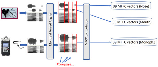 Based on the Nasometer recordings, two databases were obtained by selecting just one channel of the two-channel audio (Figure 3). A third of the database was created with the monophonic recordings. Before feature extraction, each full signal (corresponding to one speaker) was normalized to 65 dB.