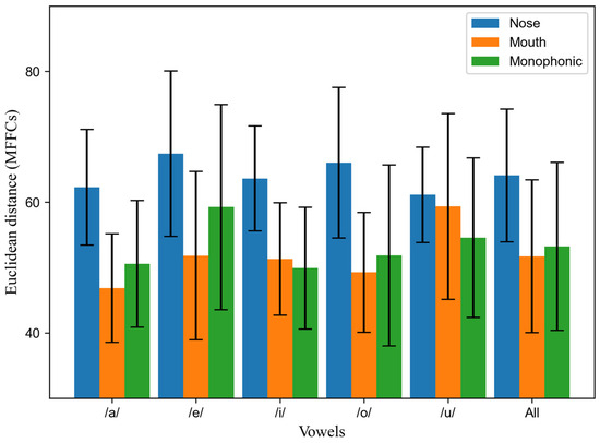 Figure 5 shows the Euclidean distances between the MFCC vectors computed for oral and nasal vowel tokens as a function of the signal type. For four of the vowels (/a, e, i, o/), the distance is the highest for the nose signal, and the distances in the mouth and monophonic signals are very similar. In the case of vowel /u/, the results are very similar in the three conditions.